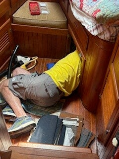 On the way to Annapolis, I noticed water on our bedroom floor. Richard checked it out and the AC drain was leaking. After we docked, Richard took the water filter out and it was clogged, so he cleaned it out and got it working properly. He crawled up under the bed in the V-berth and cleaned the filter in that AC unit as well.