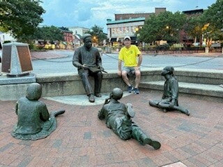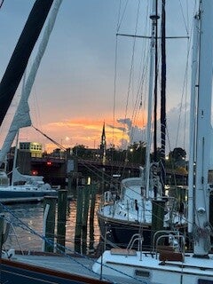 We docked at 2 pm at Annapolis City Marina after travelling 30 miles. We fixed dinner on the boat, and after dinner, we walked around the marina and into town. There is so much to do and see here that we're going to stay another day. We listened to a few young musicians playing jazz, and I took Richard's picture with a sculpture commemorating Alex Haley sharing heritage stories to young children.