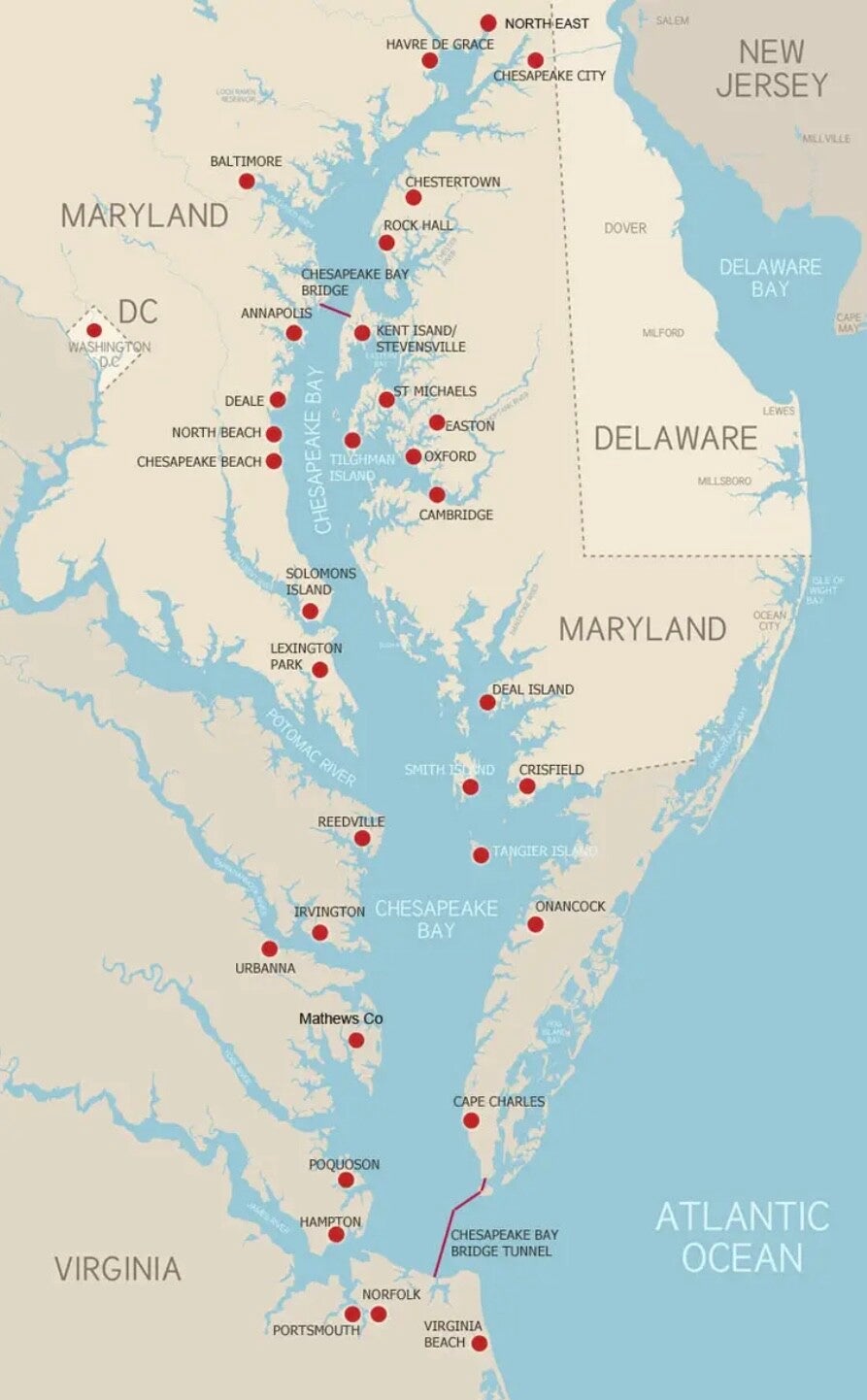 We've included a picture of the Chesapeake Bay displaying the significant stops along the Bay. We did not go to all of them, but we will give the order in which we did it so it mainly looks like a circle (with the exception of us having to cross the Bay to go North on one occasion because the trip between destinations would have taken 10 hours). When we left our marina, we travelled East on the Potomac River to the Chesapeake Bay, then across to Crisfield, MD. Then we went back across the Bay to Solomon's Island, then back across the Bay to go Northeast to Cambridge, then Oxford, St Michaels, Kent Island, Rock Hall, then across to Baltimore, and down the Bay to Annapolis, Galesville on the West River, Deale, back again to Solomon's, then into the Potomac River to Point Lookout Marina near St. Mary's City, then back to Mattox Creek.
